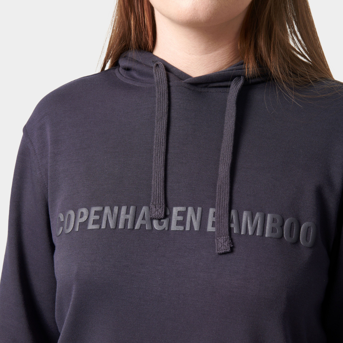 Mörkgrått joggingset för kvinnor bestående av mjukisbyxor och en hoodie. Båda plaggen är tillverkade av bambuviskos, ekologisk bomull och polyester.