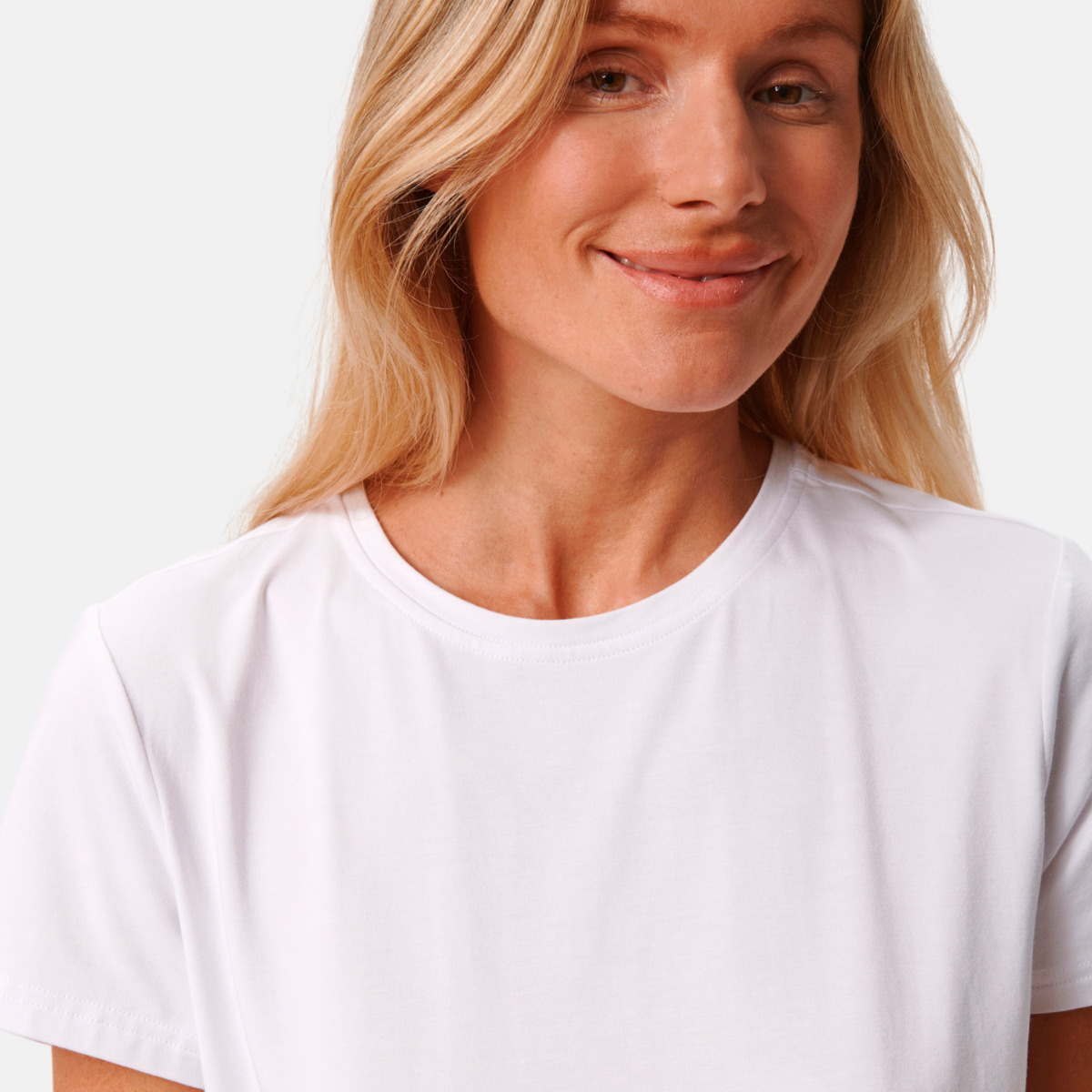 Denna vita kortärmade bambu T-shirt för kvinnor är gjord av den mjukaste bambu. Bambufibrerna gör att T-shirten både andas och temperaturreglerar, så den är bekväm att använda både sommar och vinter.
