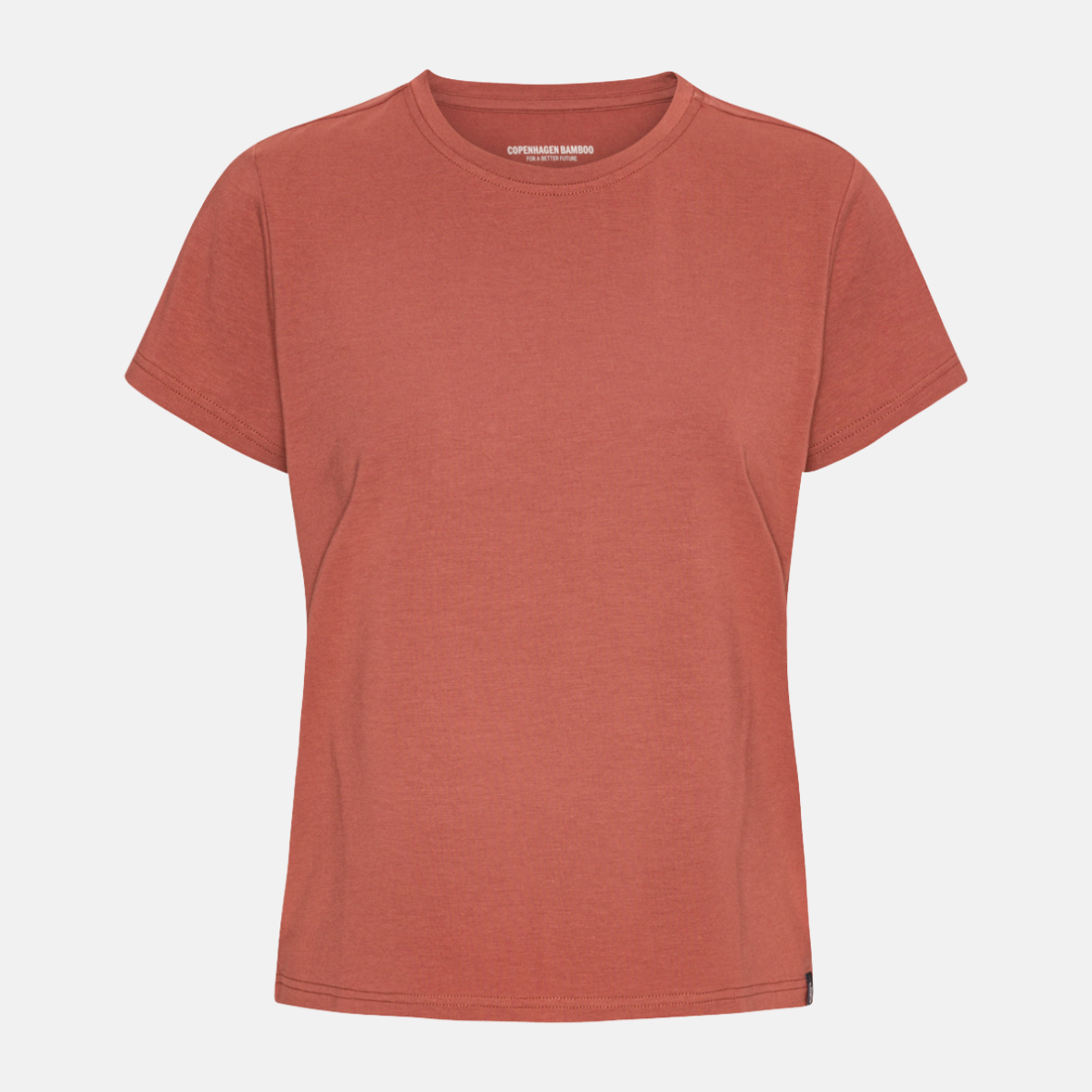 Denna kortärmade bambu-t-shirt för kvinnor i terrakotta är gjord av den mjukaste bambu. Bambufibrerna gör att T-shirten både andas och temperaturreglerar, så den är skön att ha på sig både sommar och vinter.