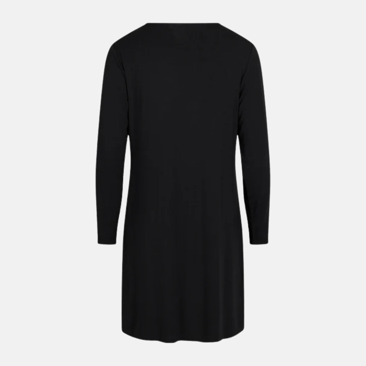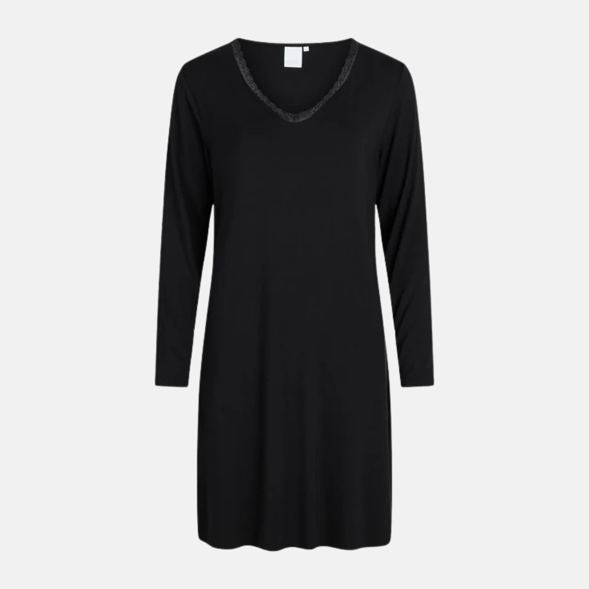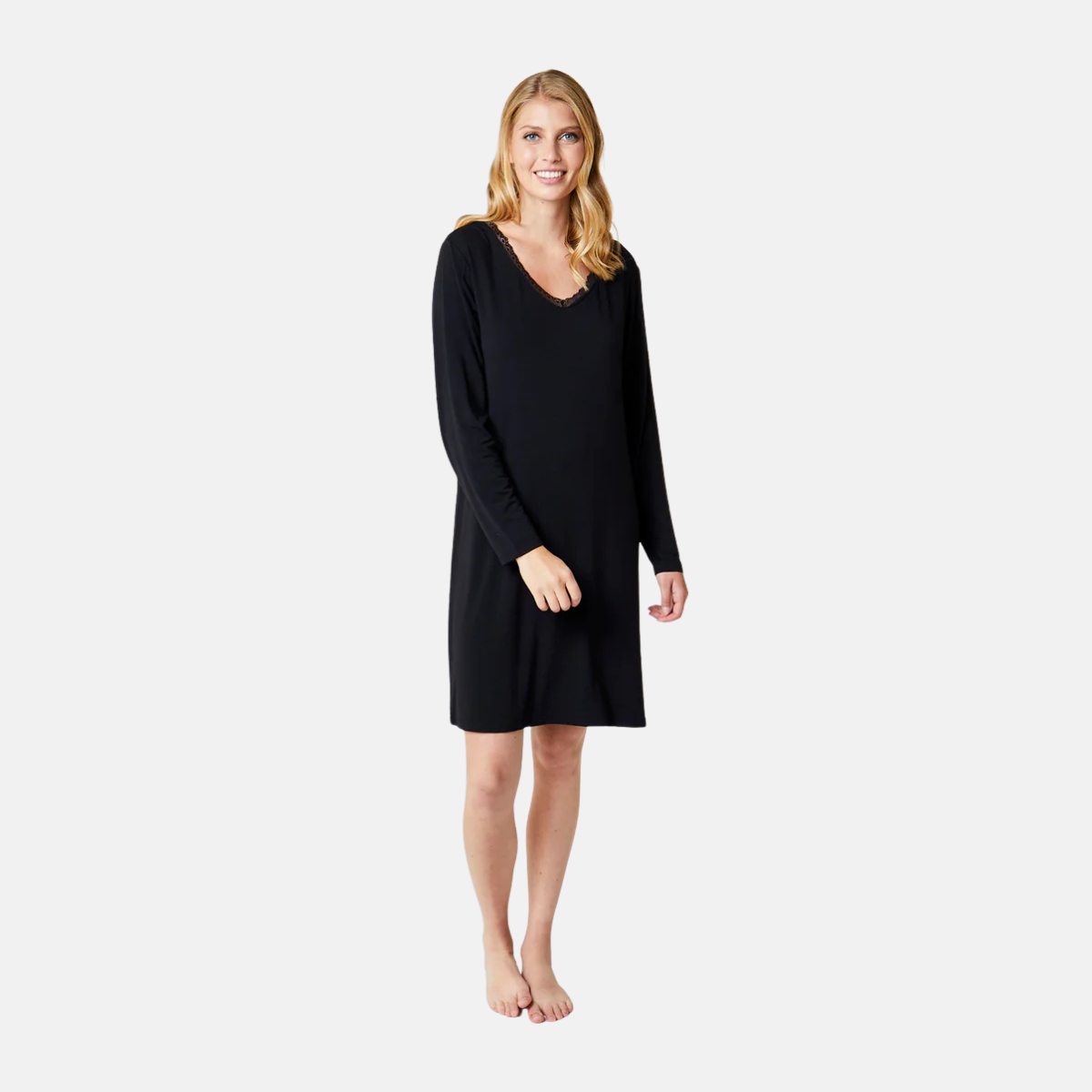 Feminint nattlinne i bambu med långa ärmar i svart. Nattlinnet har v-ringning med smal spetskant och längden är strax ovanför knät.