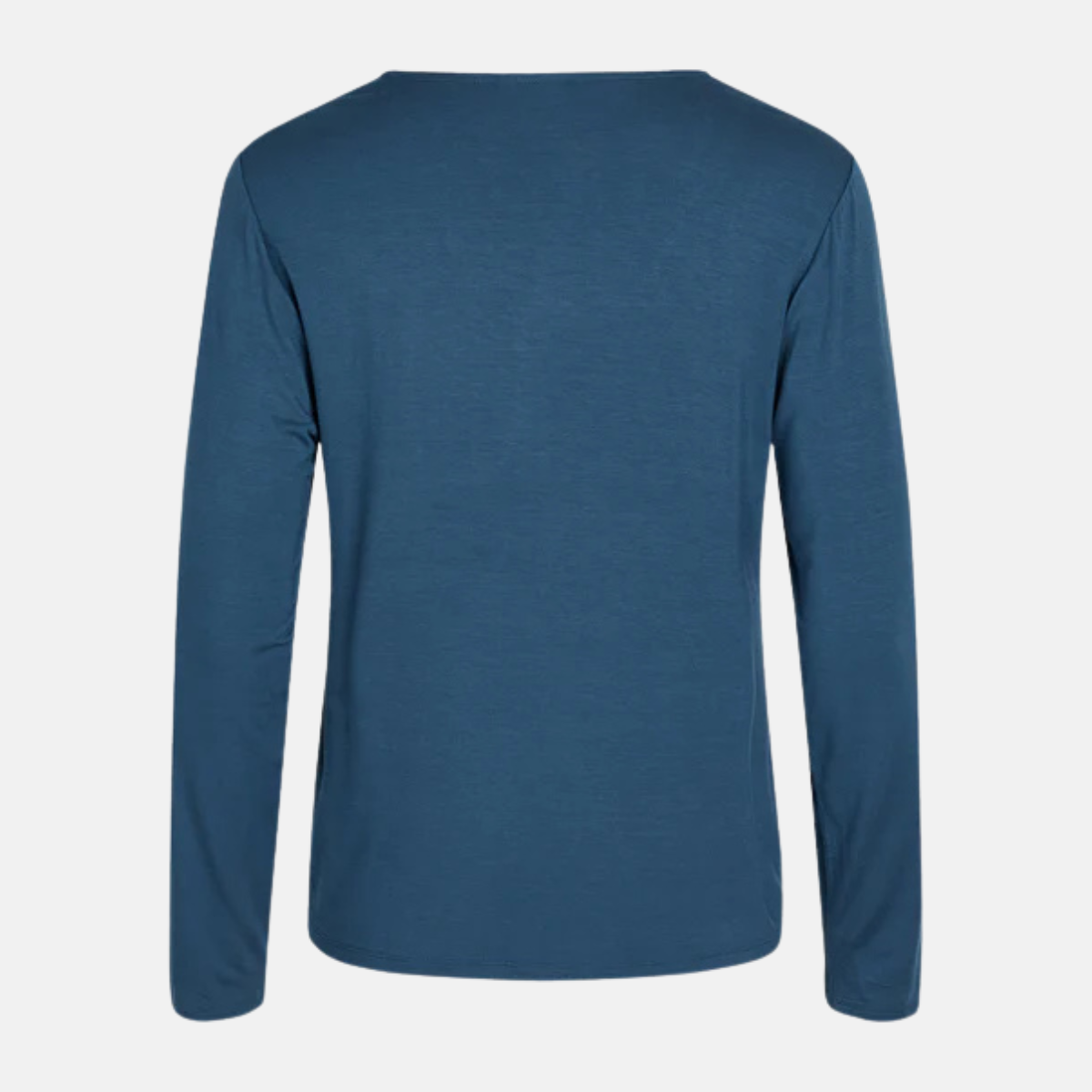 Feminin nattskjorta i bambu med långa ärmar, i dammblått. Nattlinnet har v-ringning med smal spetskant.