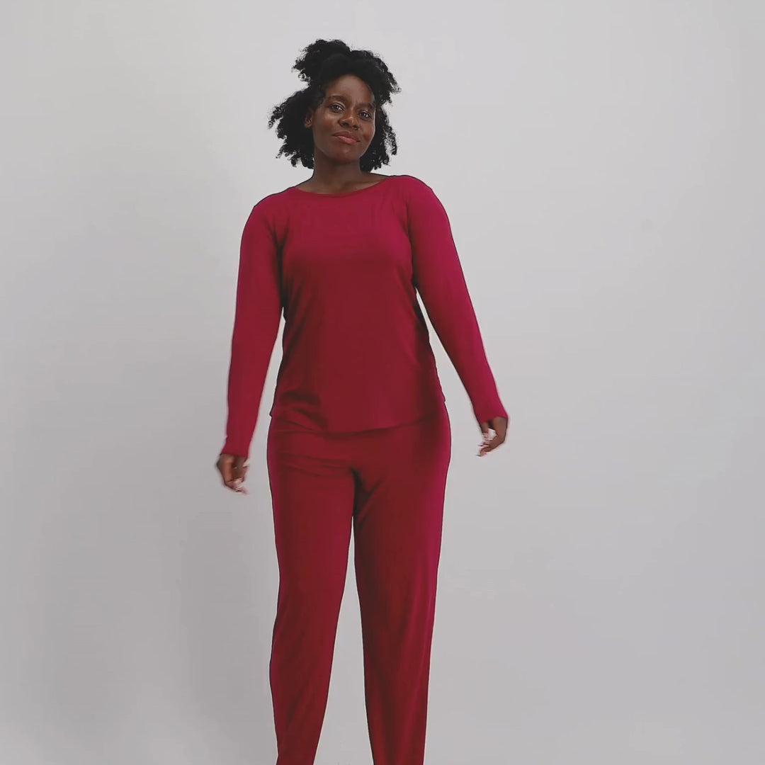 Elegant dampyjamasset i vinrött från Bamboo Basics. Setet består av långbyxor och en långärmad topp – perfekt för avkopplande stunder hemma. En tidlös kombination av komfort, värme och stil, perfekt som mysplagg eller nattplagg.