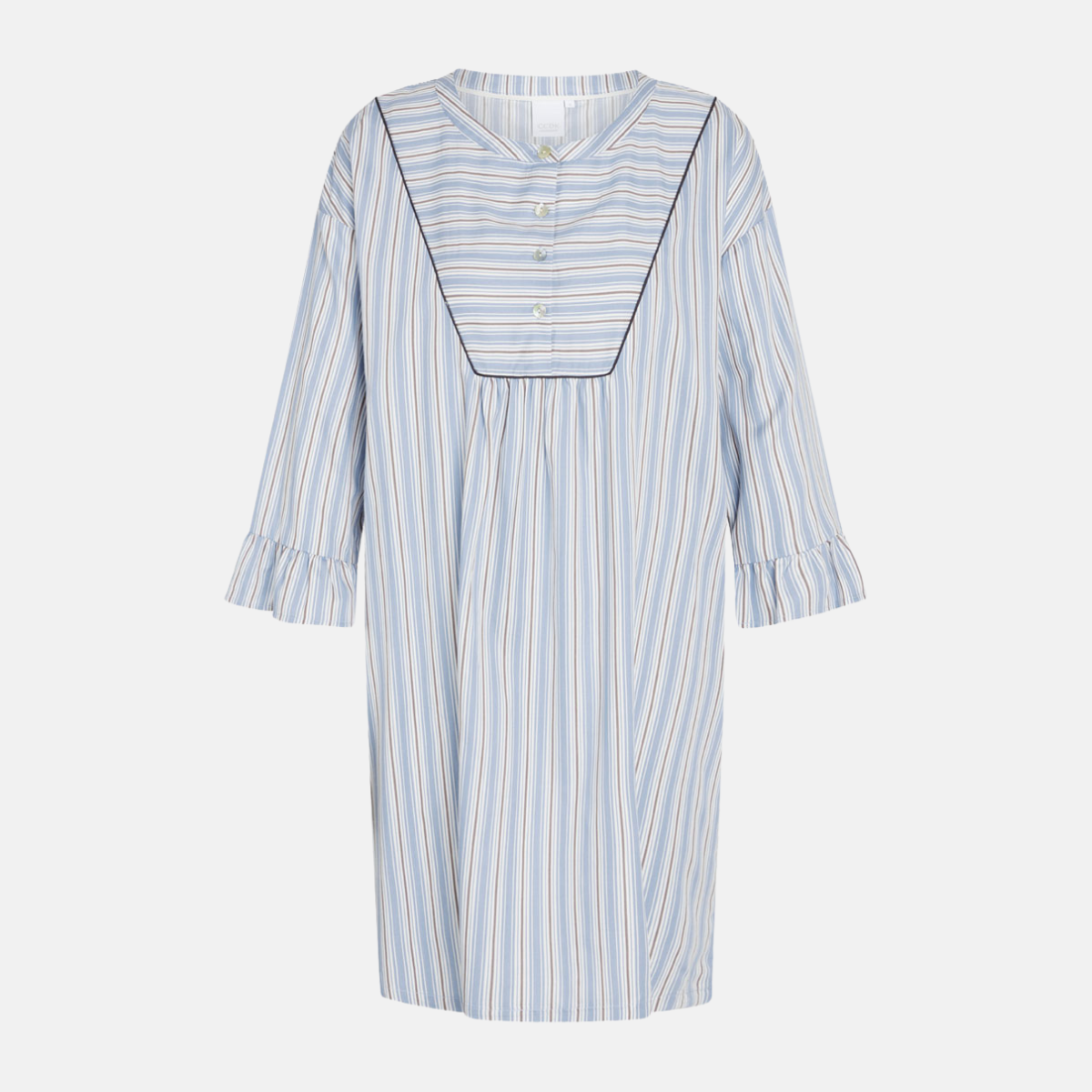 Detta nattlinne från CCDK är tillverkat i en läcker bambu- och bomullsblandning. Den har en bred hakkrage, infälld framsida med knappstängning och 3/4-ärmar med volangfåll.