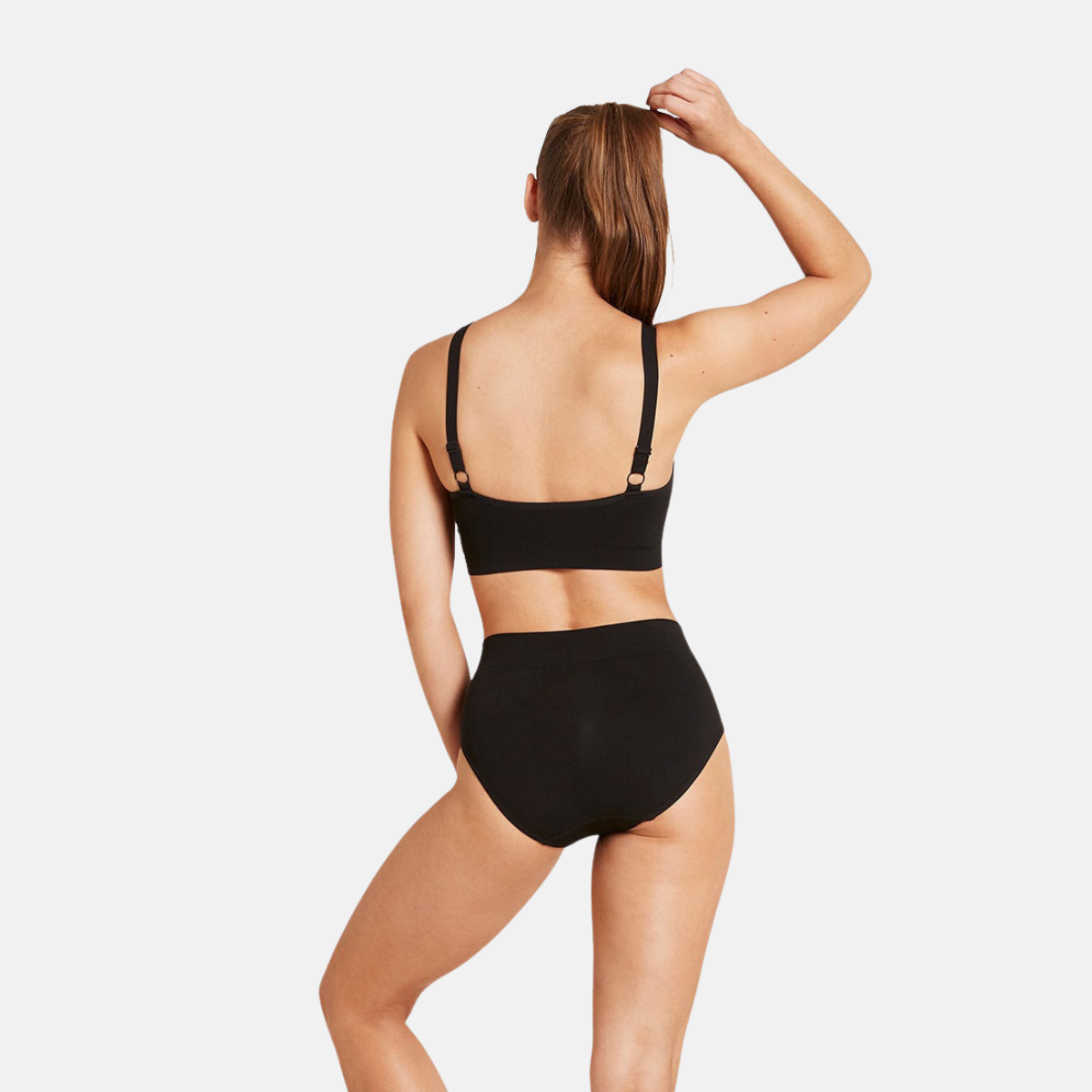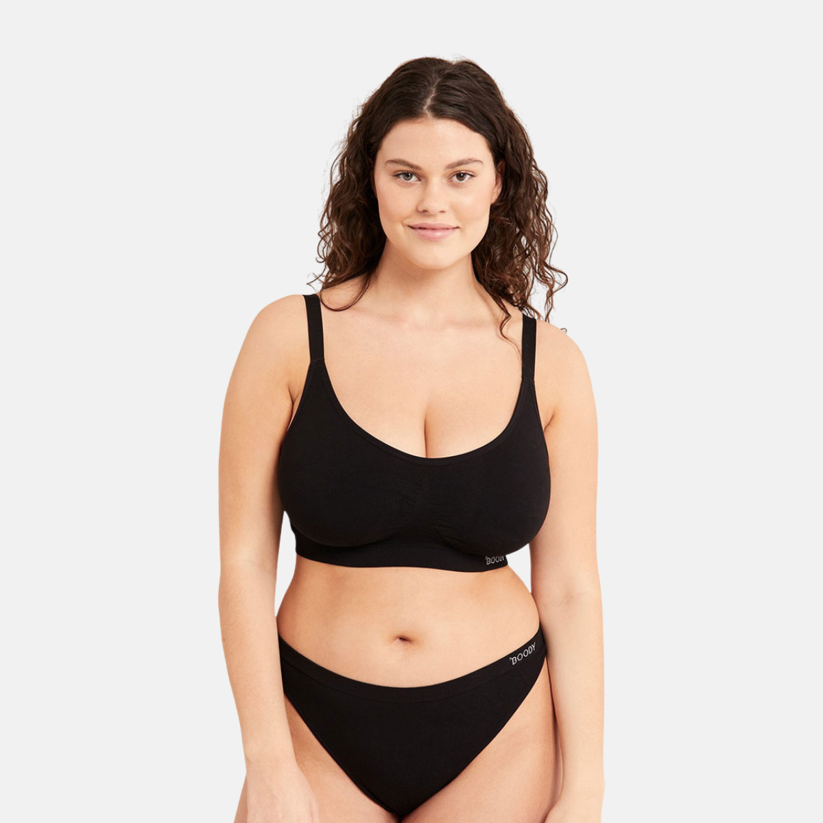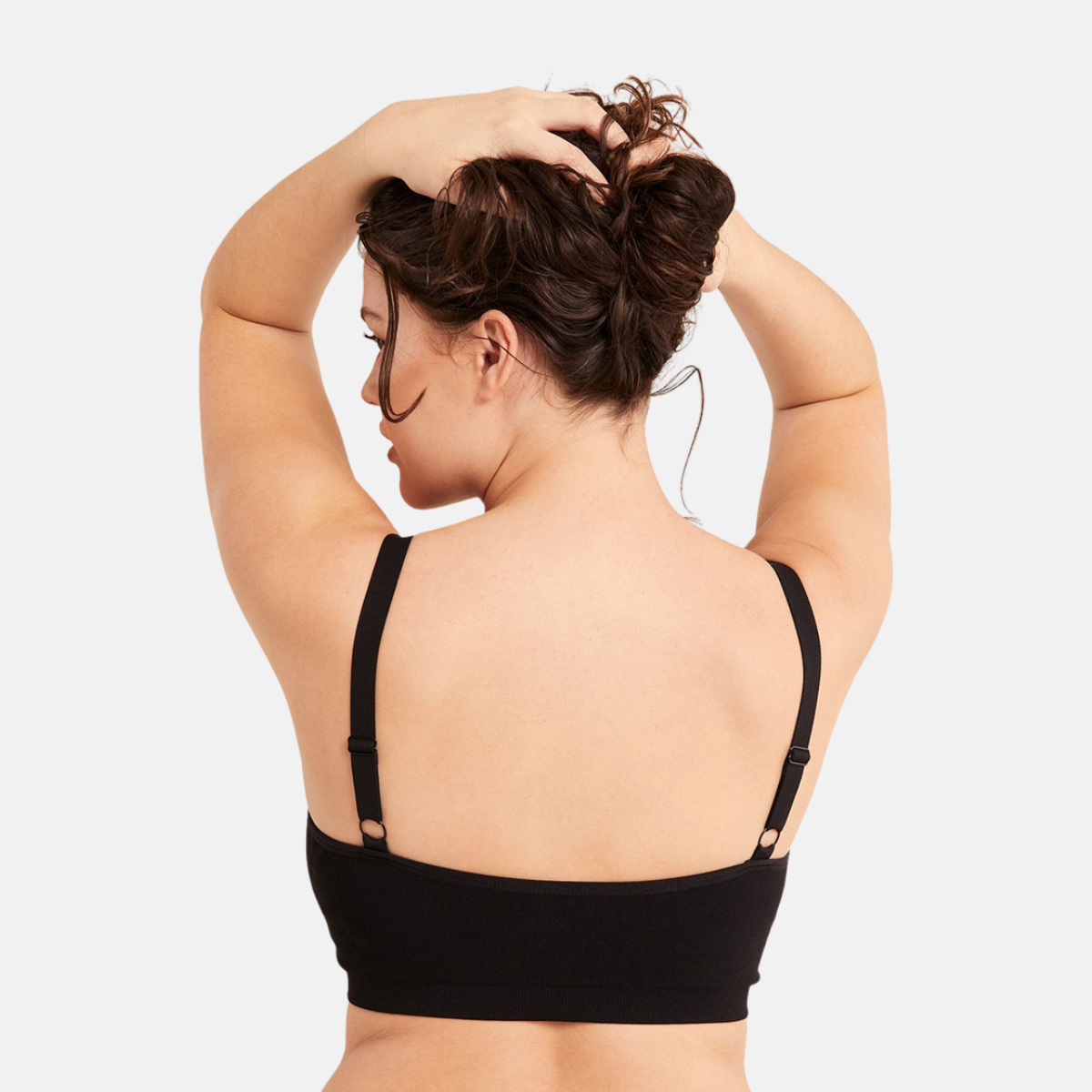 Denna svarta bh för kvinnor med stora bröst är gjord av läcker, mjuk bambu. Den är konstruerad i en sömlös, dubbla lager och trådfri passform. BH:n ger bra täckning över hela bysten och har justerbara, breda axelband.