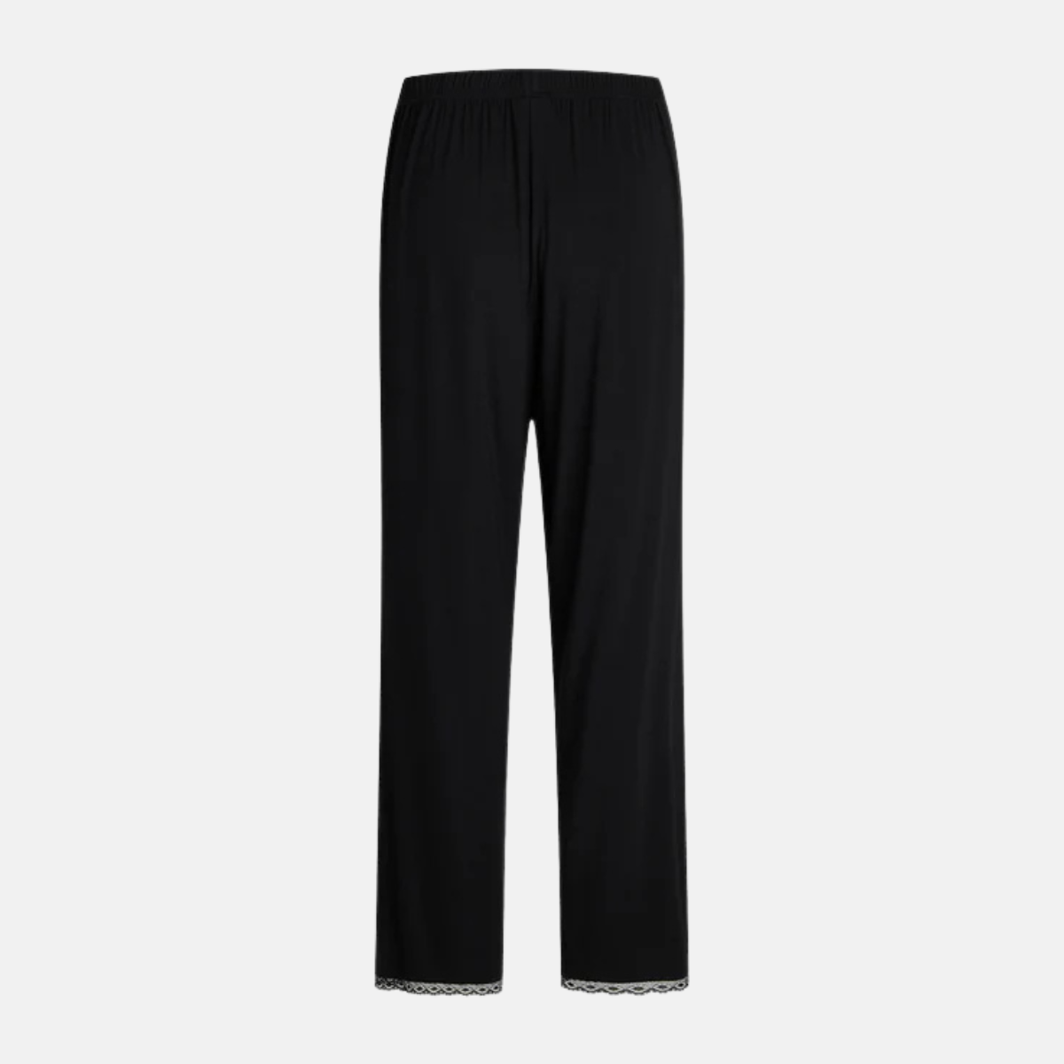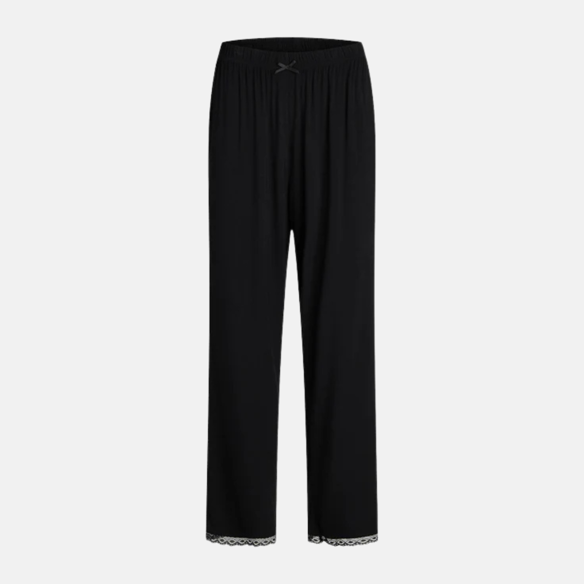 Feminina svarta nattbyxor i bambu. Nattbyxorna är detaljerade med en smal spetsbård längst ner på benen, har ett elastiskt midjeband med en liten påsydd rosett i satinband.
