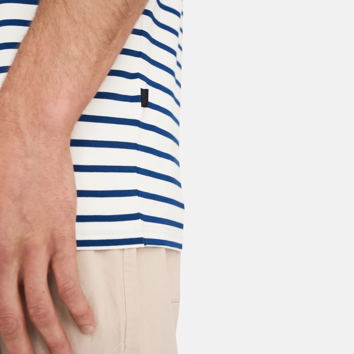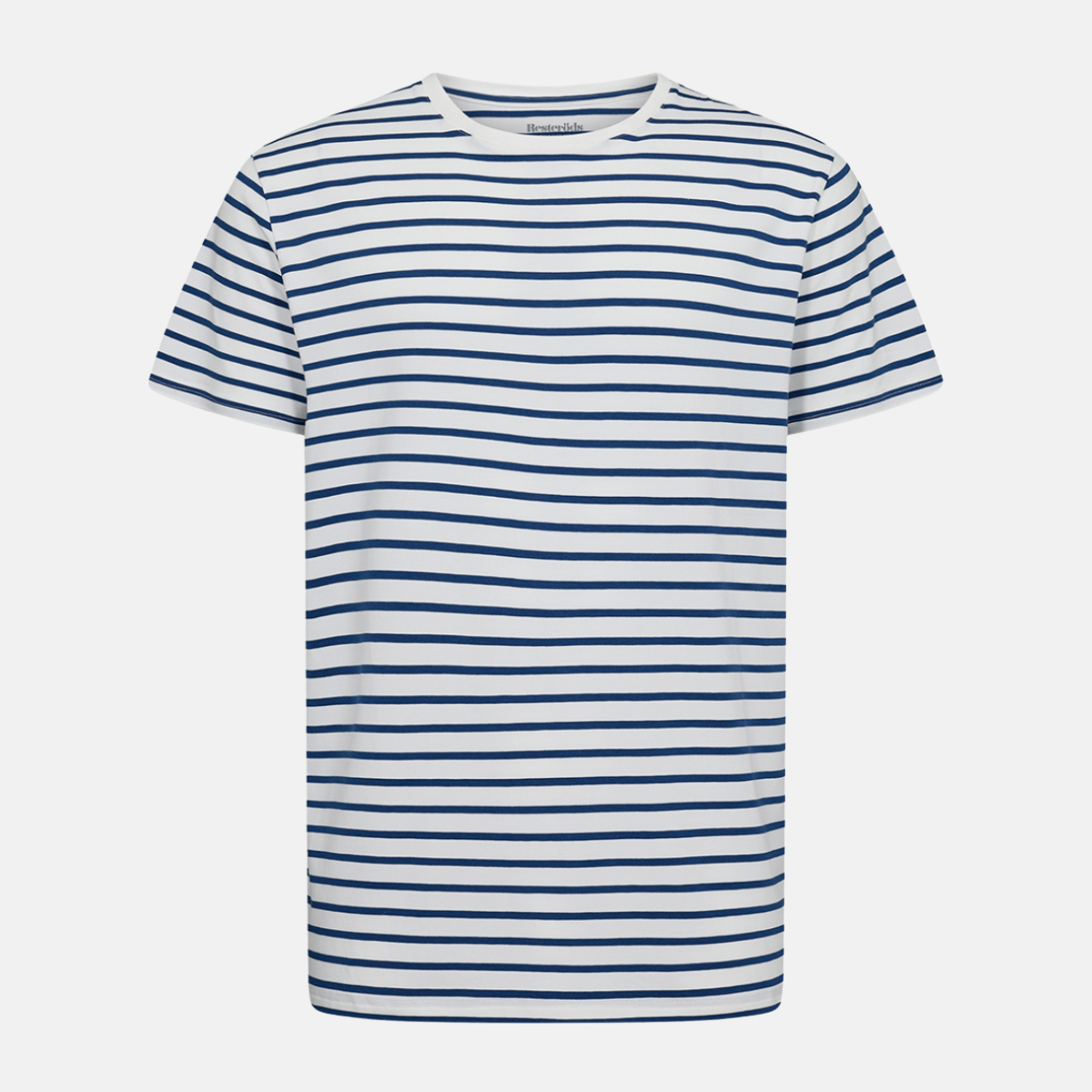 En klassisk marin/vit randig bambu-T-shirt med rund hals i hög kvalitet och perfekt passform, från Resteröds. Eftersom den är gjord av bambu är den underbart mjuk, andas och temperaturreglerande.