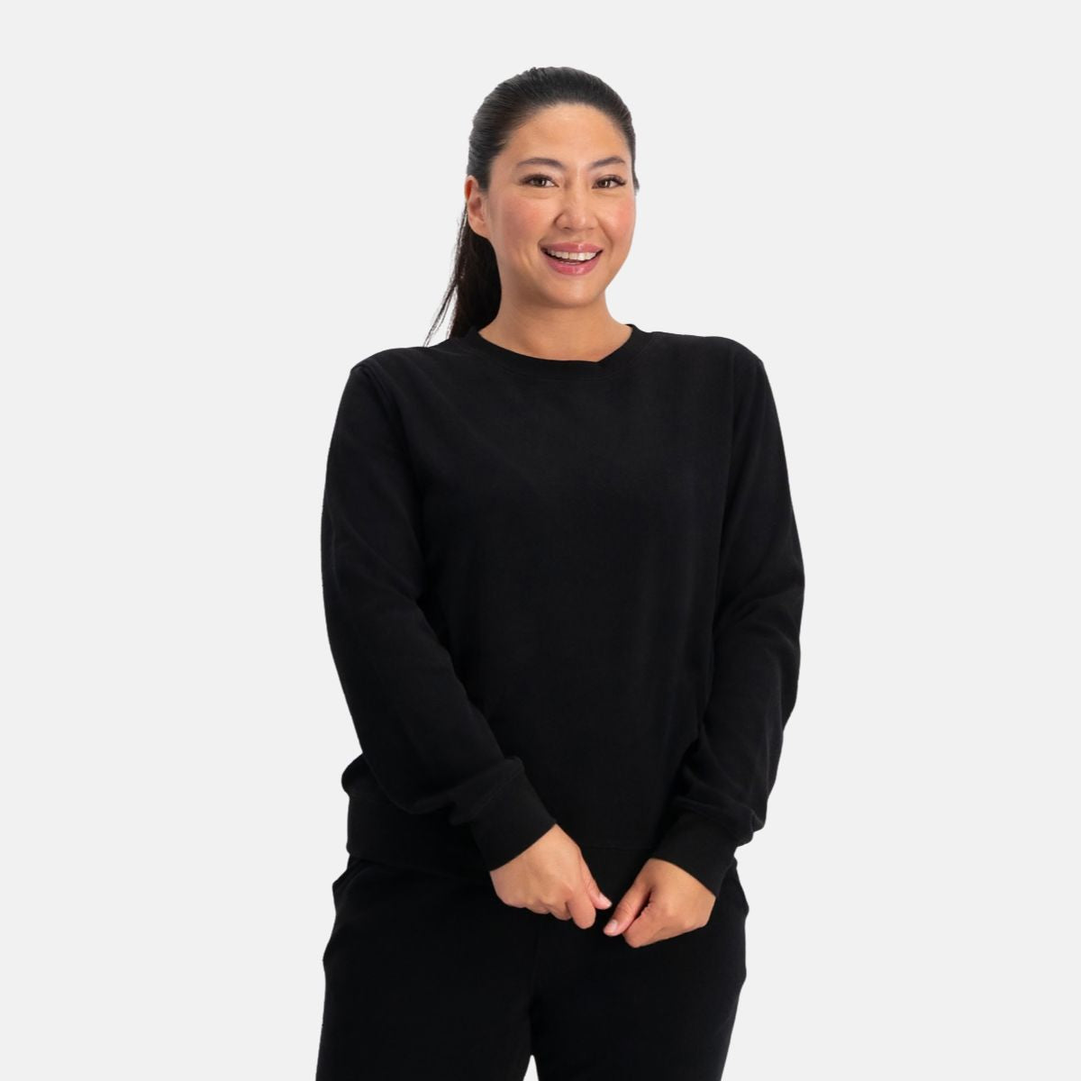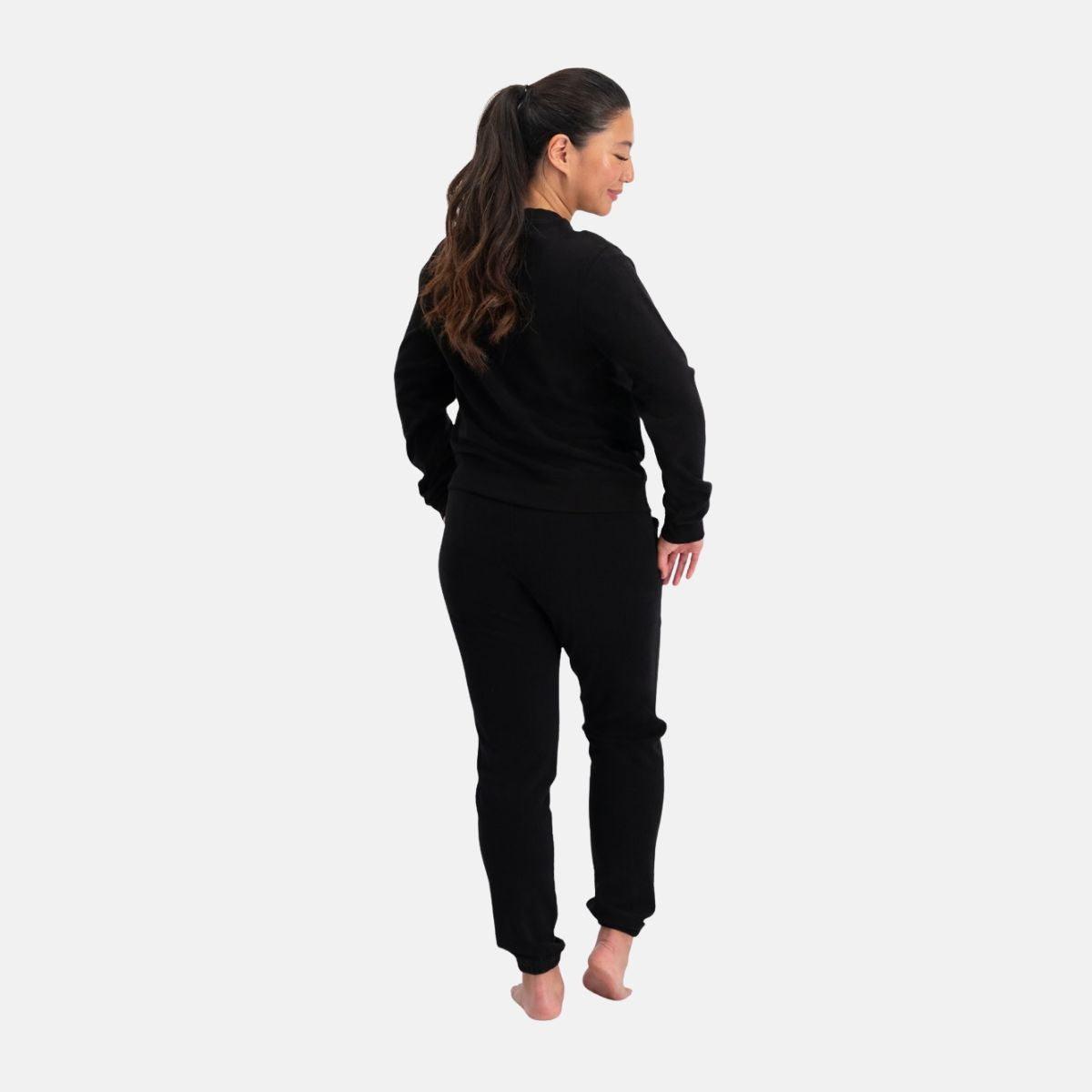Dette sorte joggingsæt til damer fra Bamboo Basics kombinerer en varm og silkeblød bambus sweatshirt med komfortable sweatpants i matchende stil. Begge dele har en tidløs, afslappet pasform og en blød kvalitet, der gør sættet perfekt til hygge, afslapning og fritid.