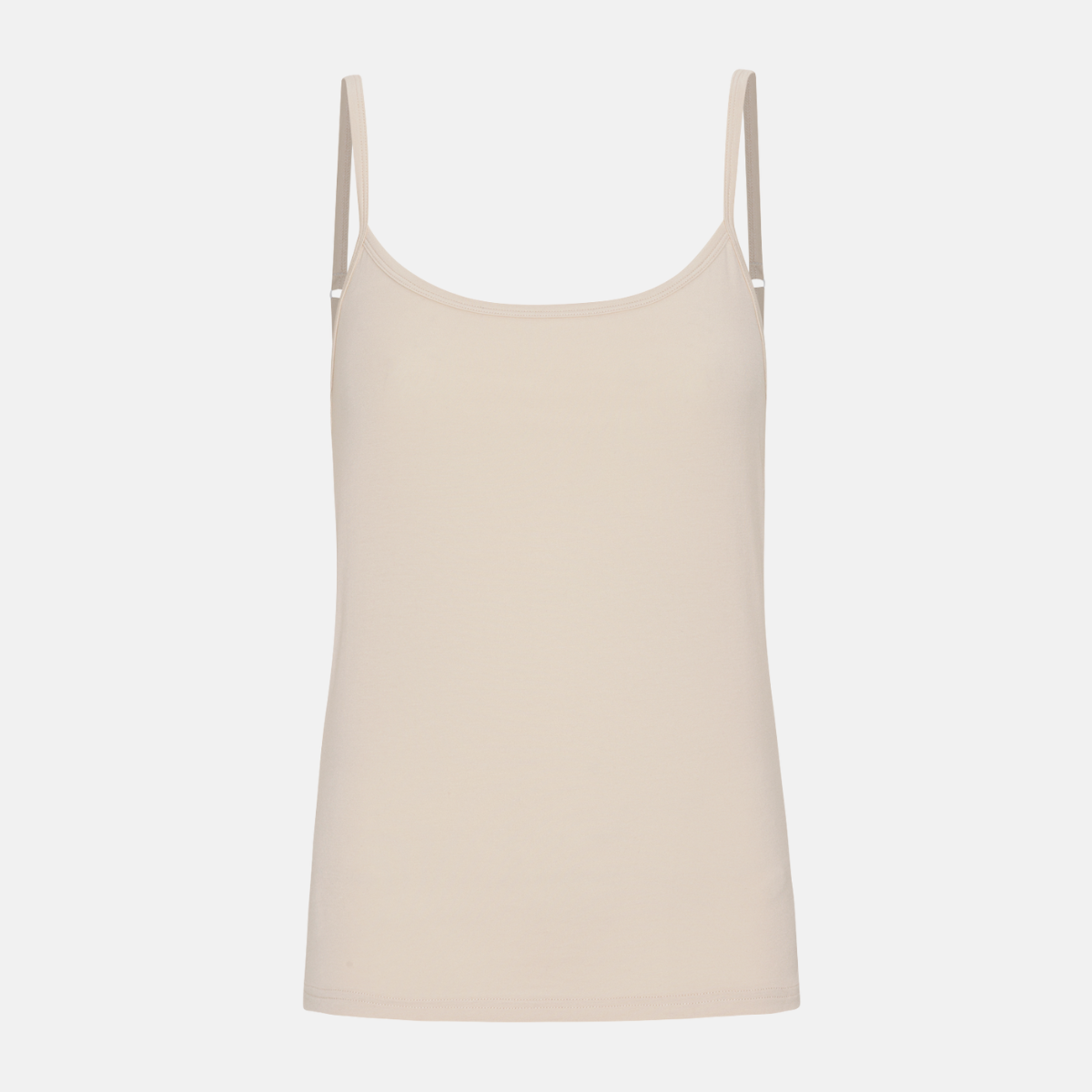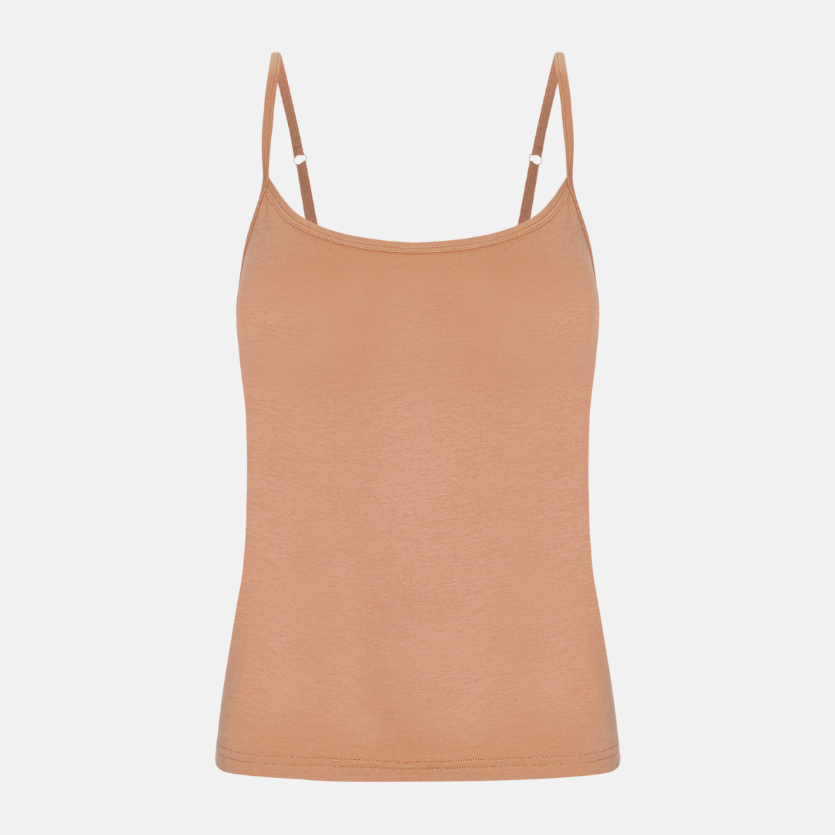 Dessa bambutoppar har sidsömmar och tunna justerbara axelband och kan bäras i en mängd olika kombinationer, dag som natt. Du får 2 i brun och 2 i krämfärg i detta 4-pack.